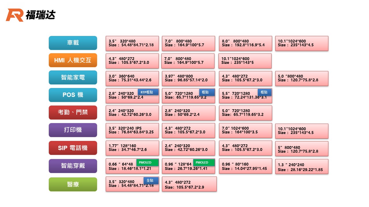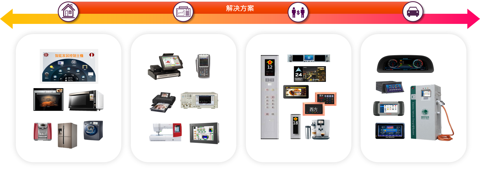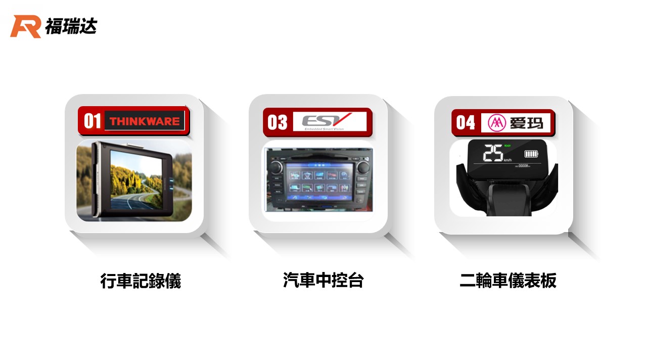炒菜鍋、攪拌機、摩托車儀錶、車載、醫療、3D 打印機、咖啡機、洗衣機、冰箱、新風控制器、空氣清淨機、快餐店 POS 機、商場 POS 機、自由基檢測儀、智能飲水機、遙控器、商用電話機、電子秤、其他醫療設備(血壓器 / 血糖機 /體脂計)、充電設備(各式機器設備 / 閘機 / 充電樁)、儀錶(手持設備 / 手持POS)...